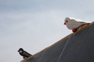 写真右上を見ると、屋根の上にも文鳥がいます。